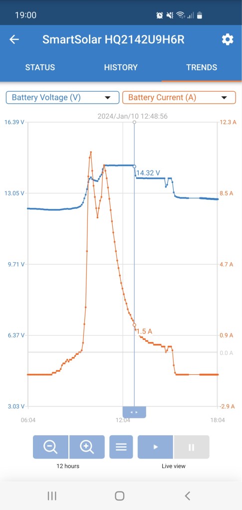 Jak v praxi funguje nabíjení baterie ze solárního panelu v zimních měsících. Mám olověný trakční akumulátor 12V 65Ah a na něj připojenou trvalou zátěž – několik WIFI routerů o celkové spotřebě 15W. Akumulátor nabíjím jedním solárním panelem 450W a pokud není dostatek slunečního svitu, vypomáhám si nabíječkou připojenou na noční proud. Pro řízení nabíjení používám solární regulátor Victron SmartSolar MPPT 75/15.