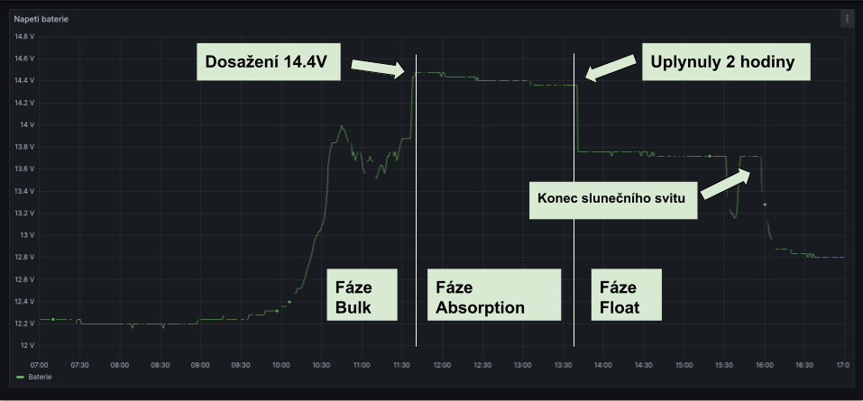 - Fáze „float“. V této fázi udržuje konstantní napětí 13.8V. Fáze končí při poklesu slunečního svitu, kdy končí nabíjení jako takové.